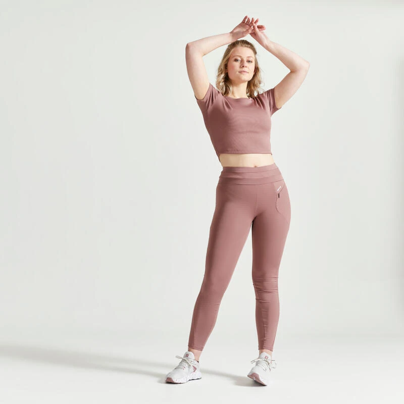Camiseta Fitness Crop Top Manga Corta Mujer Domyos Marrón