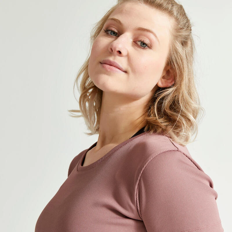 Compra en Decathlon Camiseta fitness crop top manga corta Mujer Domyos El crop top es el corte estrella de las camisetas deportivas, diseñado en punto de canalé extensible y transpirable para todas tus actividades deportivas.