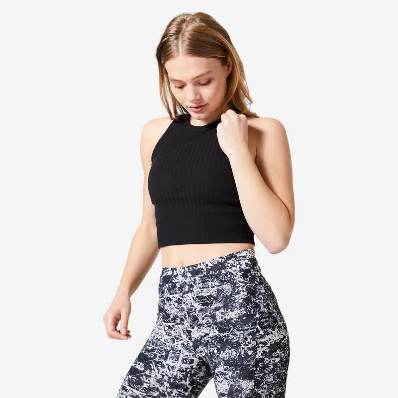 Compra en Decathlon Camiseta fitness tirantes crop top canalé 520 Mujer Nuestro equipo de entusiastas ha diseñado esta camiseta crop sin mangas ajustada de mujer para estar elegante durante tus sesiones deportivas.