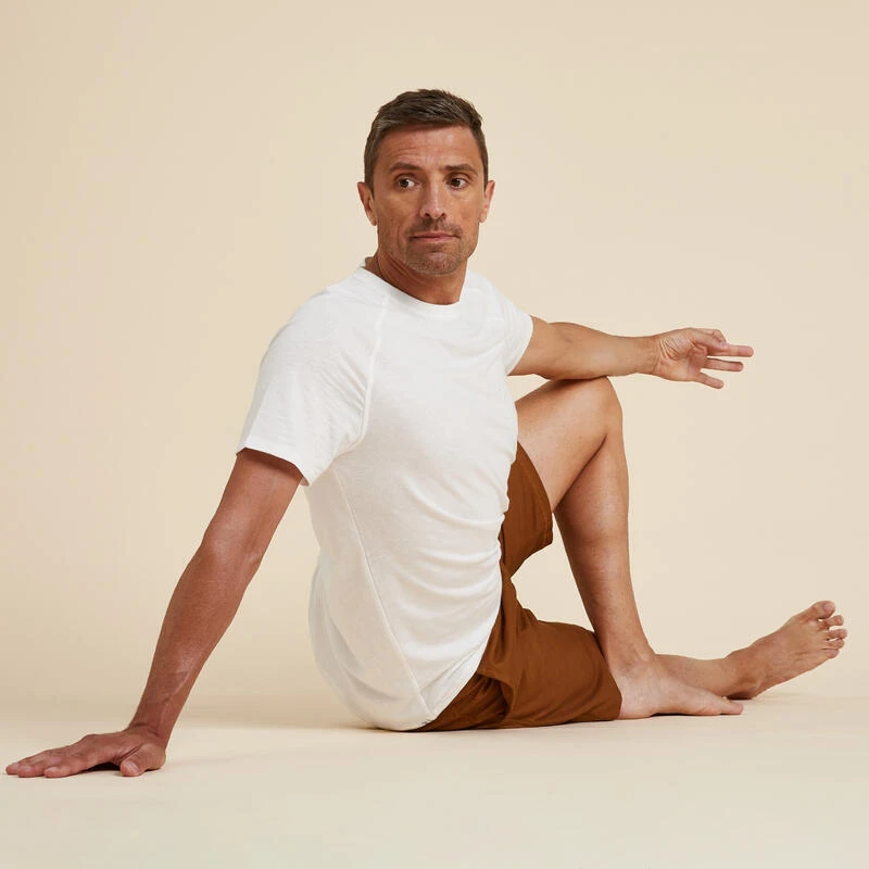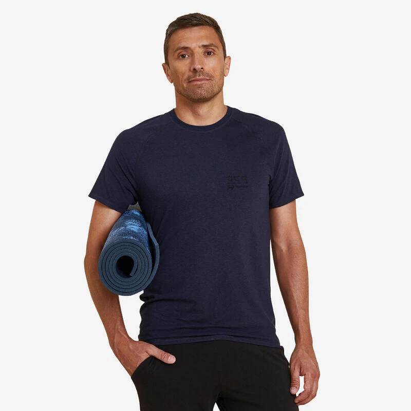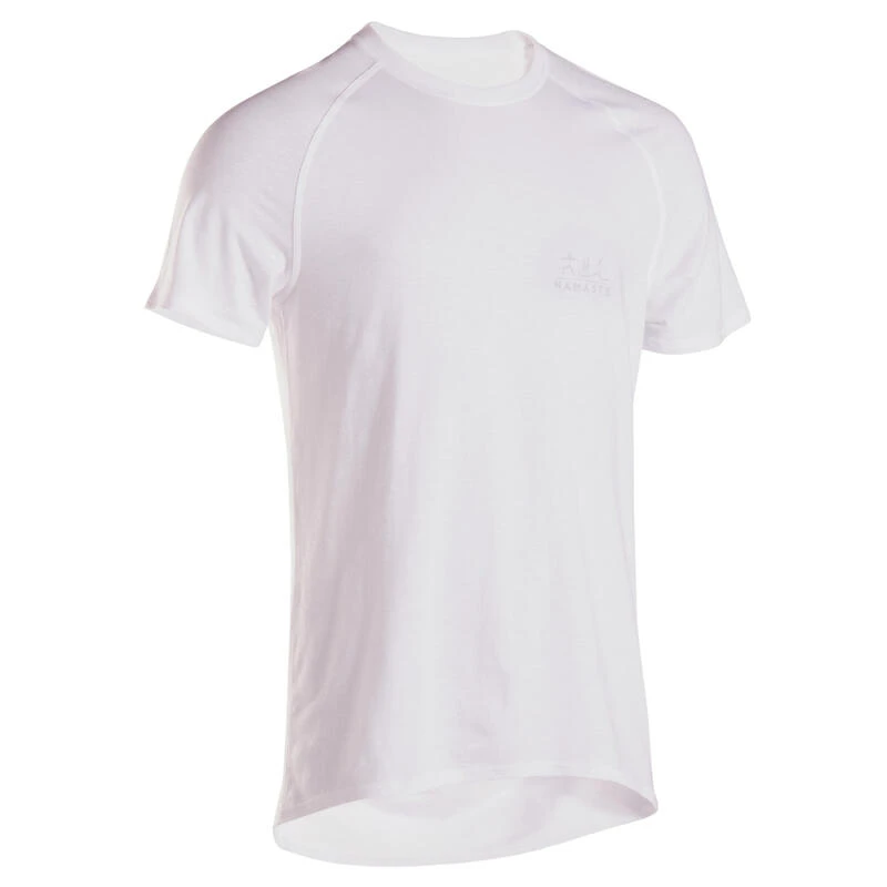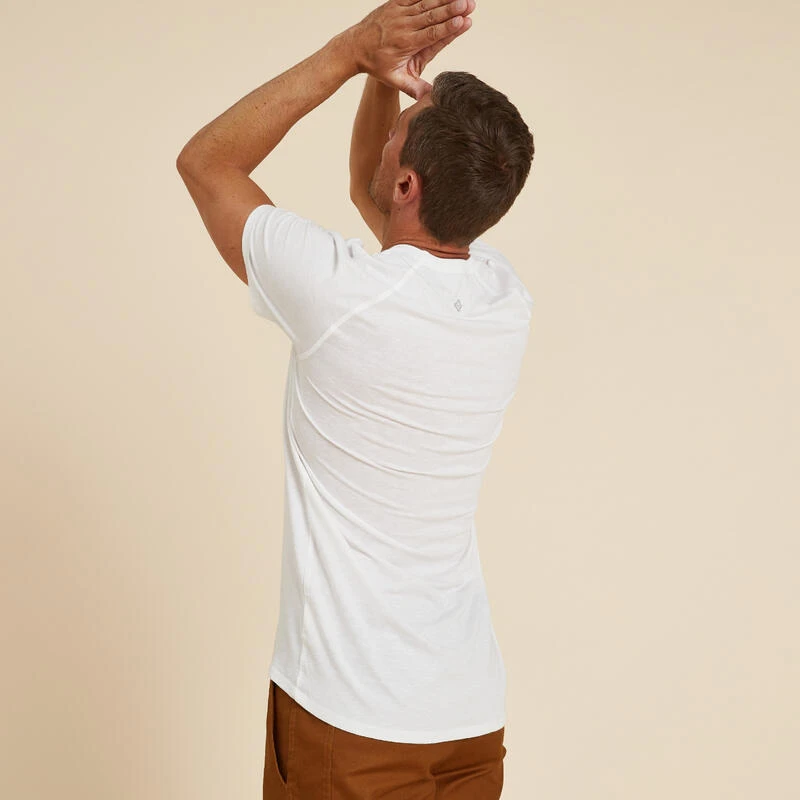 Compra en Decathlon Camiseta yoga suave manga corta Hombre Kimjaly Camiseta muy ligera de material natural. Muy suave, extensible y más larga que una camiseta clásica, te olvidarás de ella durante las sesiones de yoga o meditación.